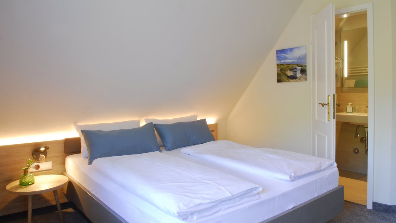 Unser kleines DZ mit Dachschräge (Bett 1,60m) mit Balkon und neuem kleinem Bad eignet sich perfekt für Einzelreisende die ein Doppelbett bevorzugen oder für 2 Personen für eine Kurzreise.