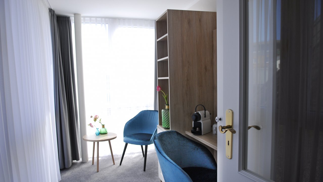 Alle Zimmer im Haus am Wäldchen fallen sofort durch Ihre markanten blauen Samtstühlen auf und erwarten unsere Gäste mit modernen Bädern. Zum Frühstücksraum, Sauna und zur Rezeption gelangen Sie zu jeder Jahreszeit gemütlich durch unseren unterirdischen Verbindungsgang. Treten Sie ein....